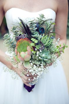 多肉植物最近十分受到歡迎,多肉的葉片俏皮可愛,只要偶爾澆一下水,多肉植物是能夠保存較久的時間,伴隨著這股潮流,近期可愛的多肉植物也變成婚禮花束的款式之一。多肉植物可以搭配顏色較為柔和的花朵或是白色的小花去調整綠色植物的單調感。但若你選擇多肉植物是為了呼應環保的話,不妨也可以考慮綠色的葉子做稍微的造型設計,一樣可以展現出多肉植物的整體感覺。