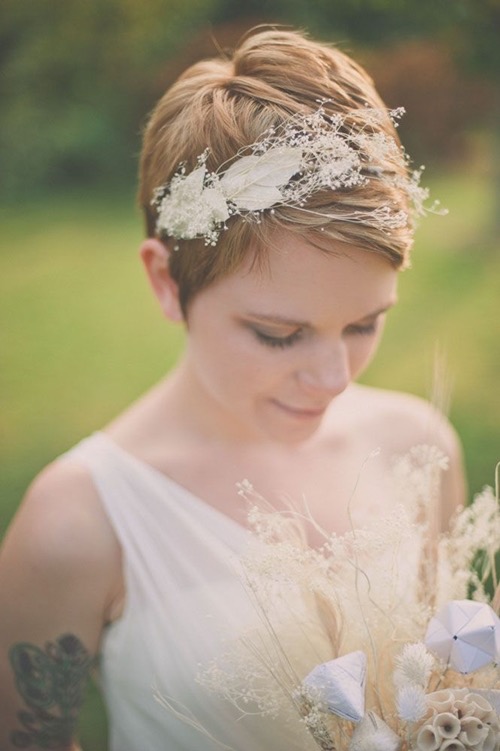 不可否認短髮的女孩在新娘髮型上能做的變化稍微少了些,但是還是可以利用一些髮飾創造各種不同好玩的造型。準新娘們可以依造自己設定的風格,下去做挑選。例如若是想走浪漫路線,可藉由花圈或小花作為點綴,或是帶有點復古路線的新娘造型,選擇亮片的髮帶和薄紗髮帶也會是不錯的玩法。