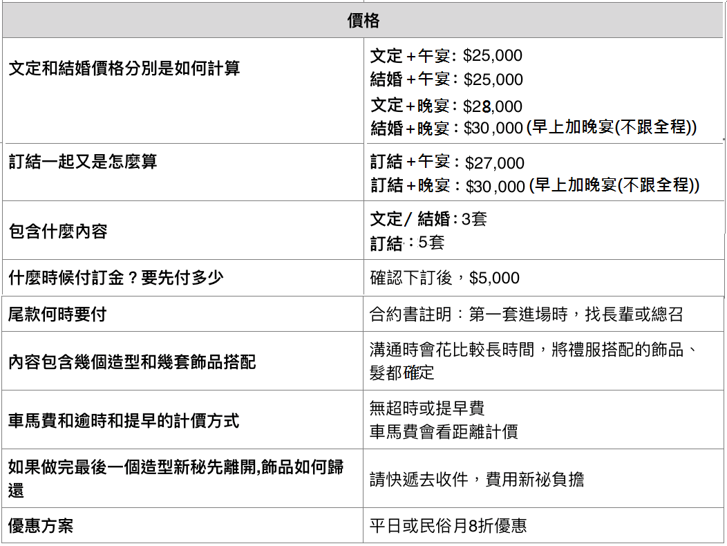 靜瑀:還沒有預約前新人會先打來諮詢,那我們會跟新人說明服務的內容跟費用,確定有達成共識也確定新人喜歡我們的風格,因為現在每一位造型師的風格都非常的明顯,所以新人在選造型師的時候很重要,不要選擇一個跟自己想要的風格完全不一樣的造型師,這樣在溝通上會比較辛苦,所有都確定後就可以下訂,預付訂金$5,000;下訂後我們會進行簽約,保障雙方的權益,也會給新人一份功課,上面註明結婚前的一些注意事項及須知。