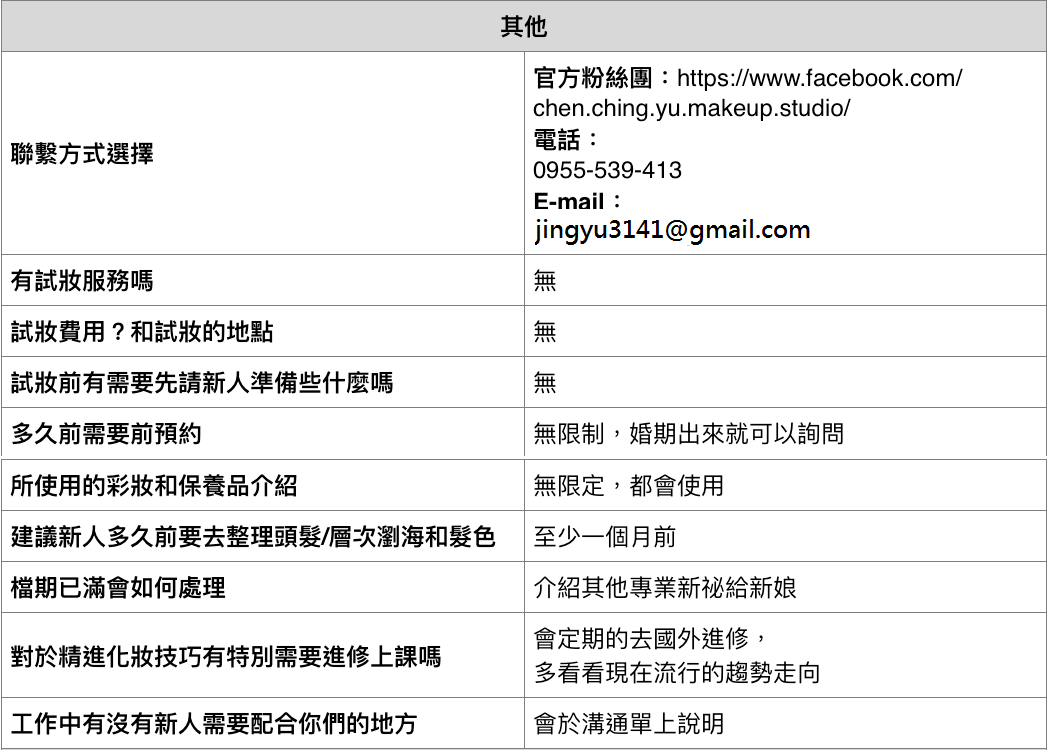 溝通時新人需要準備喜歡的妝感及造型的照片,那也要跟著禮服及自己的風格,我會開始篩選,在溝通聊天的同時我會看看他的禮服、宴客的地點、新人的需求,來決定他要畫什麼樣的妝,以及做什麼樣的造型,那溝通的時候我沒有提供試妝,因為作品照片上妝感已經很明顯了,如果你來找我且喜歡我的妝感,大概就是這個樣子;但我會就新人帶來喜歡的頭髮造型照片,適合的都試做一遍給新人看,因為化妝是比較容易的,只有分濃、淡、立體感、是否符合新娘;但造型比較難也具有挑戰性,因為還要搭配禮服,根據禮服來幫新人設計妝髮,也需要考慮到髮量多少與頭型。