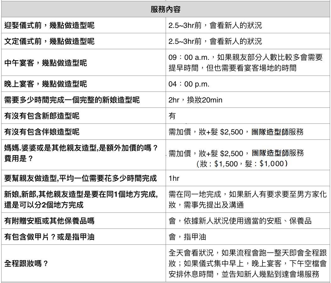 靜瑀:一個月前會進行見面溝通,那下訂時給新人的婚前須知上面會有很多注意事項,也會希望新人先看過及準備,像是如果有當天想要配戴的一些飾品,或者是想要的一些妝髮,有些特殊的材質一定要事先跟我說,我才有時間準備;另外像是皮膚、身體的保養叮嚀,頭髮的染剪燙、瀏海或層次的問題等等,我也很鼓勵新人去做微整型,搭配上造型可以讓當天看起來更美。