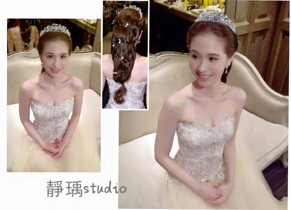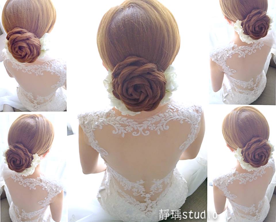 目前靜瑀的工作室有五位夥伴,她覺得每個造型師都要有獨特的風格,所以工作室並沒有一個統一的風格,但都以找到最適合新娘個性與喜好的造型為目標;基本上,造型師們會先看新人的需求,並就新人的樣子、個性、工作來做符合新人的風格造型;靜瑀的整體風格是偏簡單、氣質路線,所以通常來找她的新人在風格上都不會差異性很大,偶爾會遇到差異性很大的,靜瑀就會先詢問這樣的新人說,你喜歡的風格可能跟我習慣用的手法不太一樣,可能會不是那麼適合,會讓客人先思考確認。