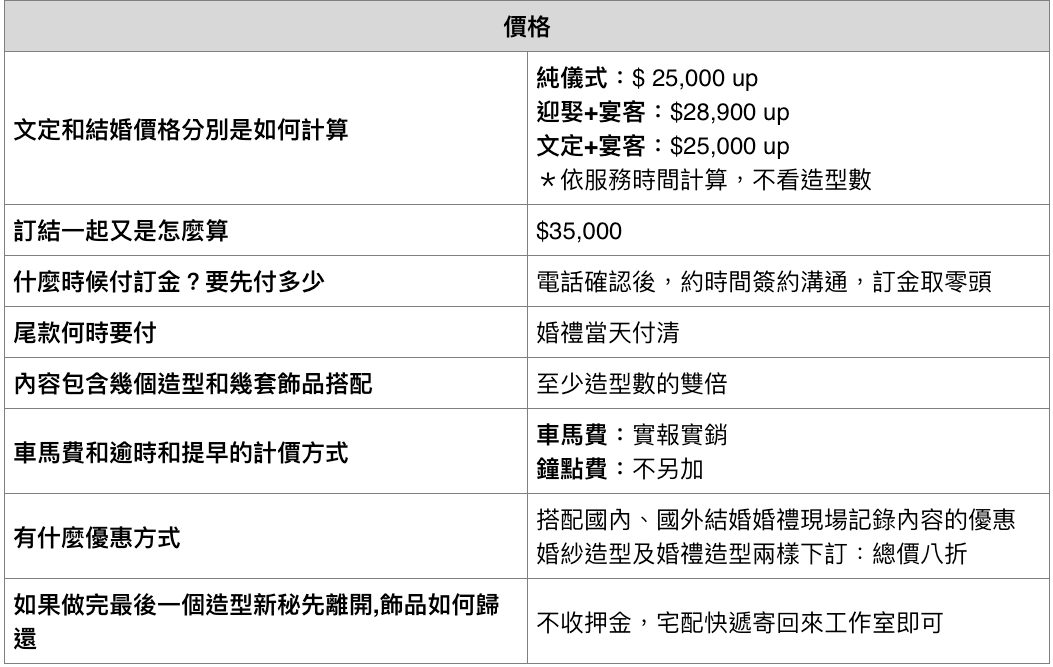 建議新人婚期確定了就可以打電話來預約,會比其他聯繫方式快,因為我們新人的時間都很快就確定;那不管是臨時或者是比較靠近婚期的時候,新人都還是可以打電話來預約看看;若確定要預約時,會有簽約的動作,內容是保障彼此雙方的權益,還有註明我們本身可以提供的服務義務,雖然內容比較簡化但還是有重點。