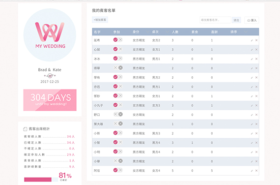 輕鬆統計婚禮出席人數隨時更新賓客人數,出席狀況一手掌握。